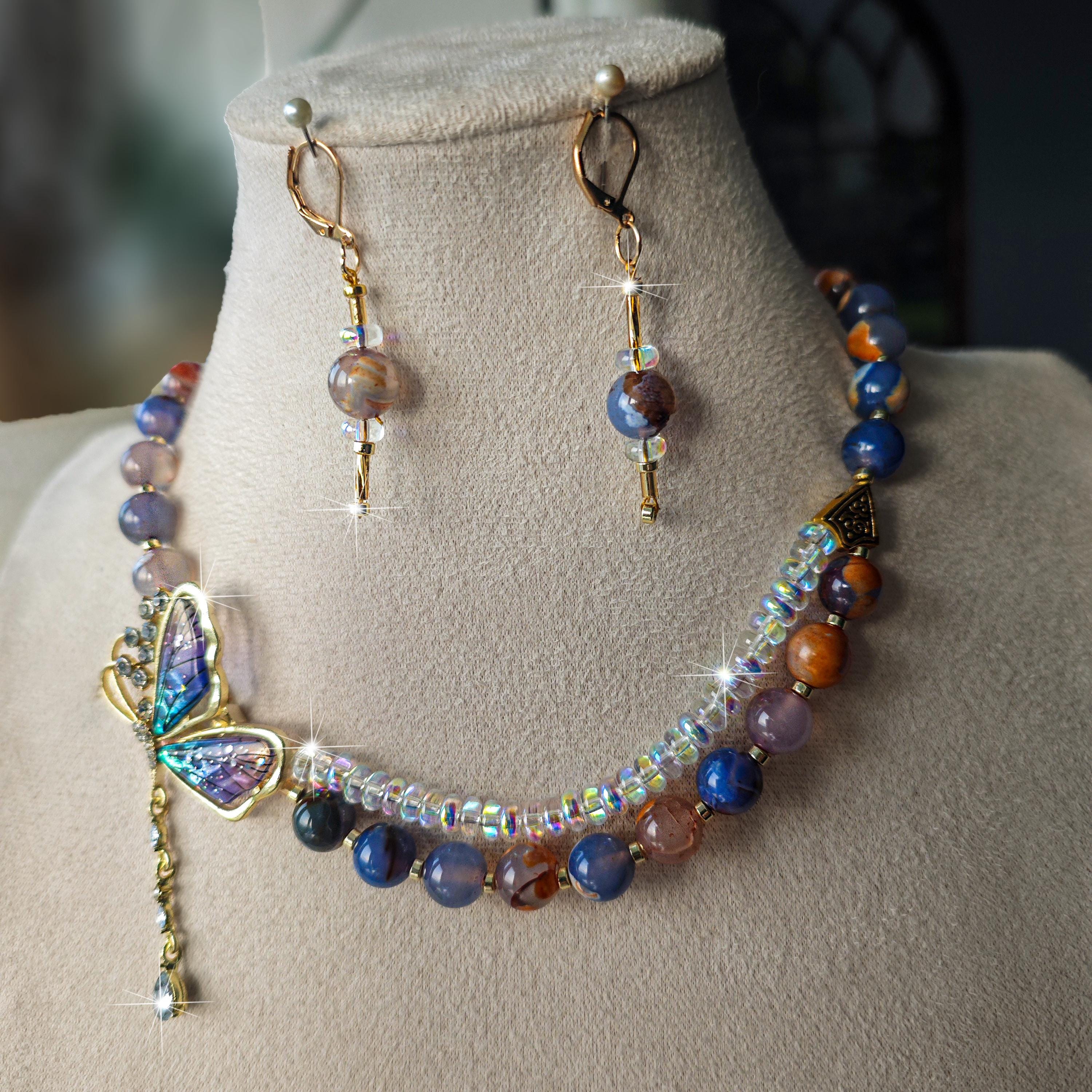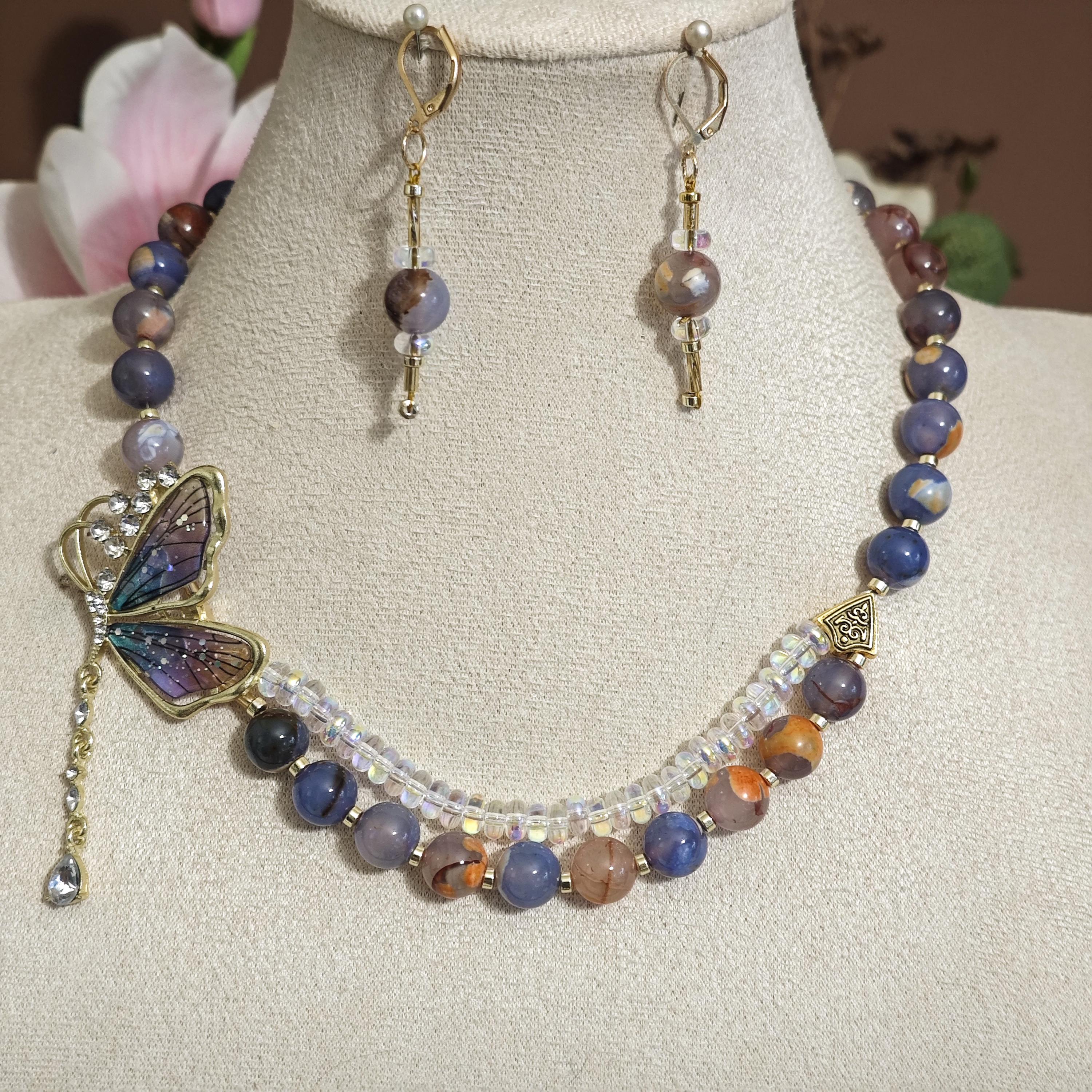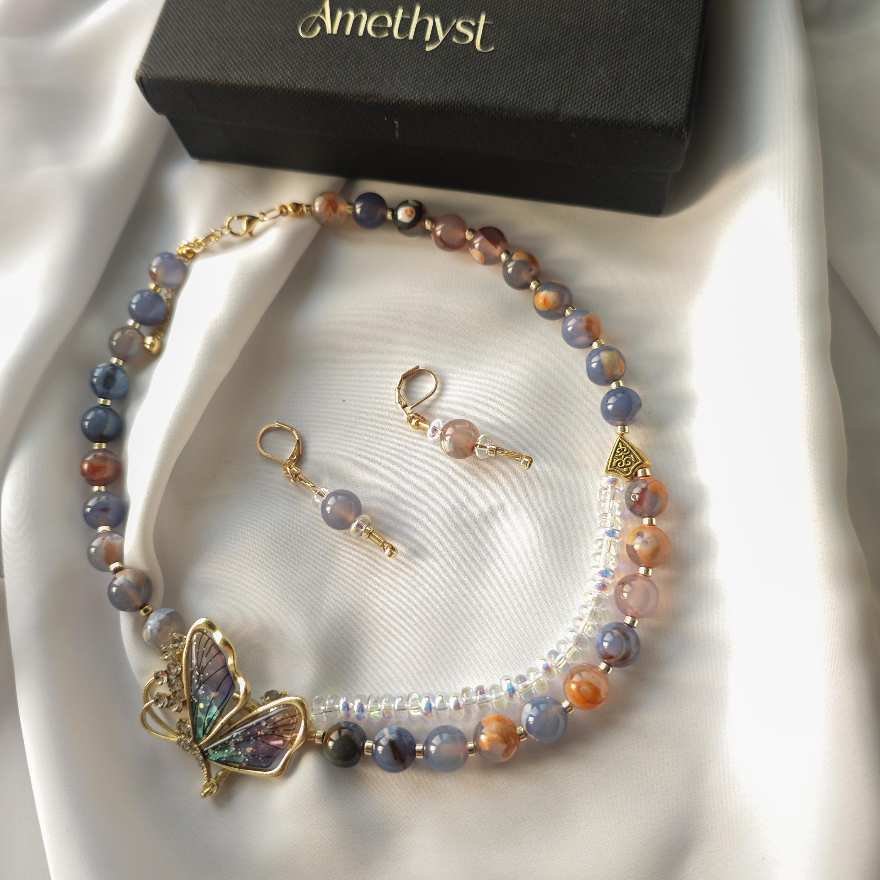 Beautiful, natural, handmade necklace made of fire agate, synthetic opal and gold plated accents. Stylish necklace. Butterfly brooch made of synthetic zircon, glass and alloy. The set also includes earrings in the style of the necklace.